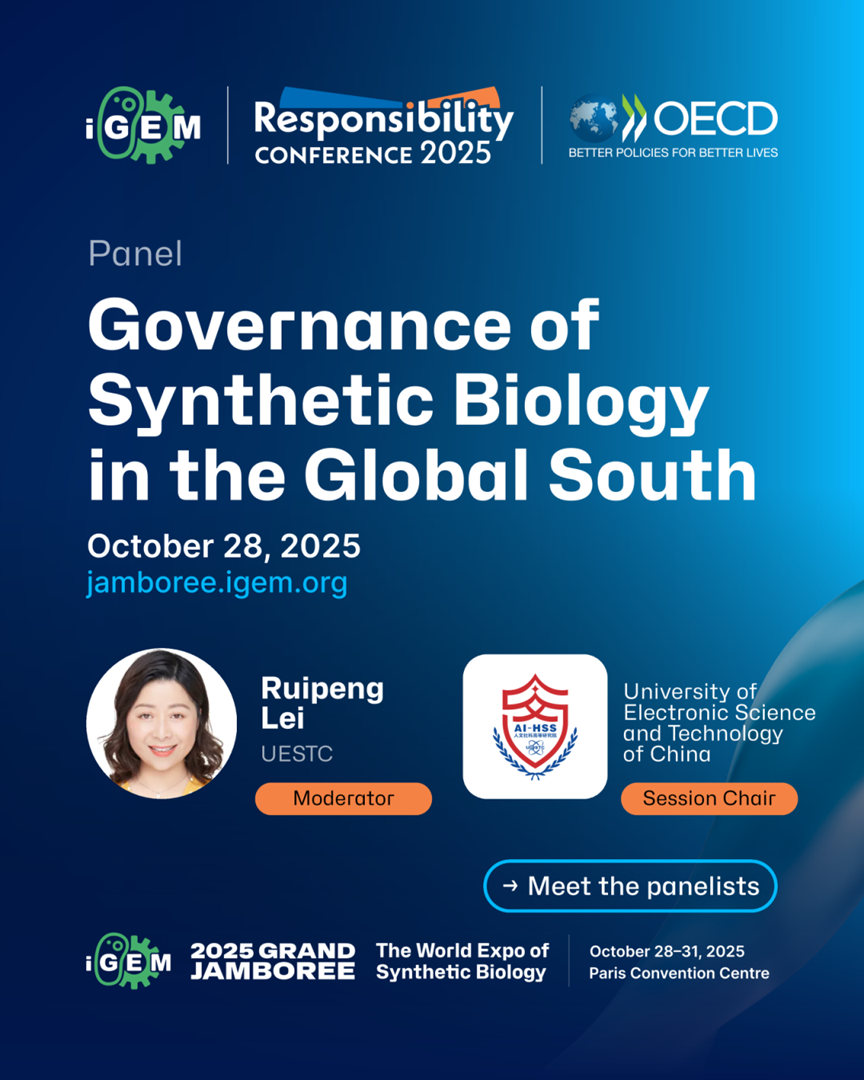 Invited by the iGEM Organizing Committee, Professor Lei Ruipeng, Vice Dean of AI-HSS, participated in the conference as the first Chinese expert to serve as a moderator at the iGEM Responsibility Conference. The 2025 iGEM Responsibility Conference consisted of six thematic sessions. Professor Lei, as the moderator of “Governance of Synthetic Biology in the Global South” session, discussed key topics such as “global governance collaboration” and “ethical norms and responsible practices”. Centering on the perspective of the Global South, this session challenged the existing governance paradigm and explored “Global Solidarity” as a normative principle and practical framework for inclusive synthetic biology governance. It examined how the current governance structure inadvertently excludes or marginalizes the voices of the Global South and explored paths to achieve more equitable participation in jointly shaping the future of technology.