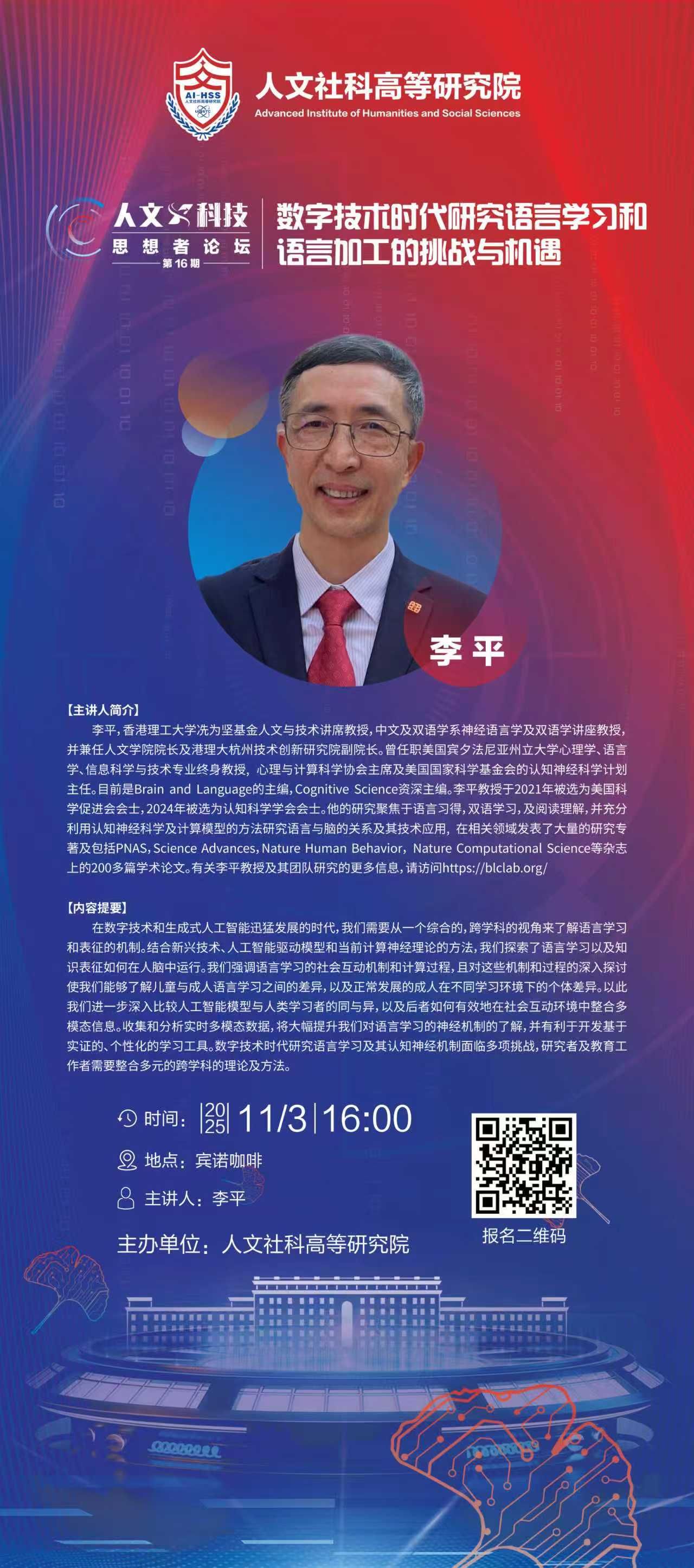 李平,香港理工大学冼为坚基金人文与技术讲席教授,中文及双语学系神经语言学及双语学讲座教授,并兼任人文学院院长及港理大杭州技术创新研究院副院长。曾任职美国宾夕法尼亚州立大学心理学、语言学、信息科学与技术专业终身教授, 心理与计算科学协会主席及美国国家科学基金会的认知神经科学计划主任。目前是Brain and Language的主编,Cognitive Science资深主编。李平教授于2021年被选为美国科学促进会会士,2024年被选为认知科学学会会士。他的研究聚焦于语言习得,双语学习,及阅读理解,并充分利用认知神经科学及计算模型的方法研究语言与脑的关系及其技术应用, 在相关领域发表了大量的研究专著及包括PNAS,Science Advances,Nature Human Behavior, Nature Computational Science等杂志上的200多篇学术论文。有关李平教授及其团队研究的更多信息,请访问https://blclab.org/